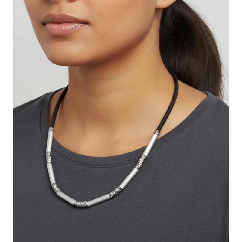 A simple contemporary necklace, with an elegant mix of anodized aluminum cylinders spiced up with thin hematite rings - magnetic closure.