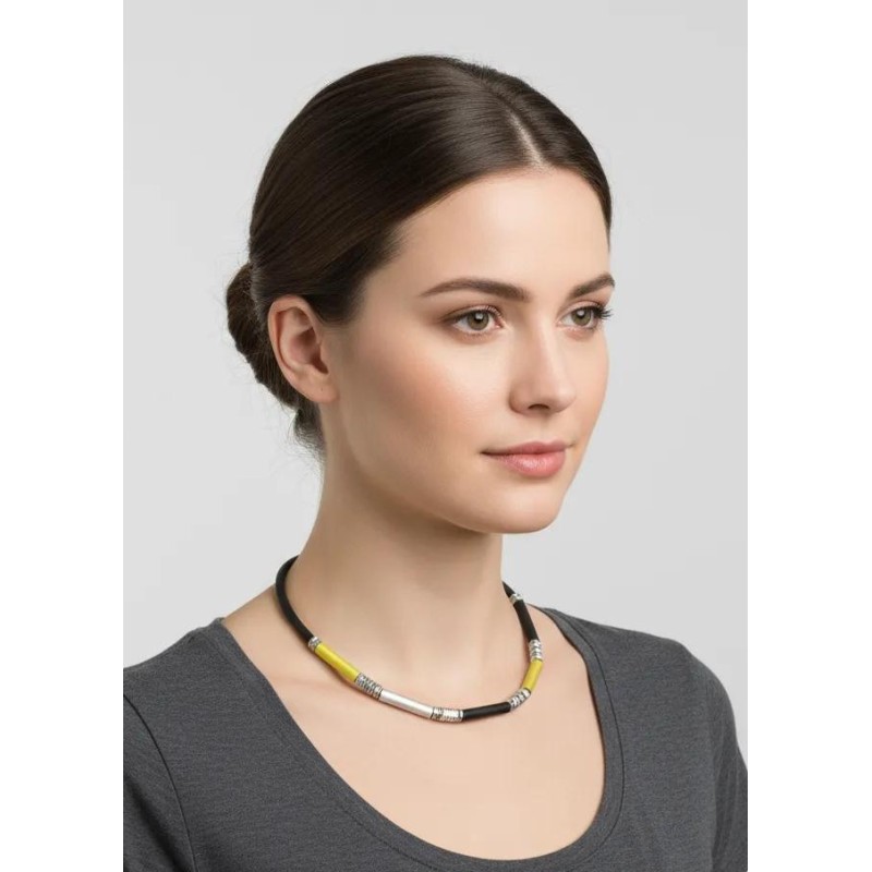 A simple contemporary necklace, with an elegant mix of anodized aluminum cylinders spiced up with thin hematite rings - magnetic closure.