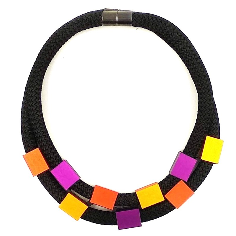 Necklace - Double strand thick cotton cord w/ staggered aluminum cubes, magnet closure
