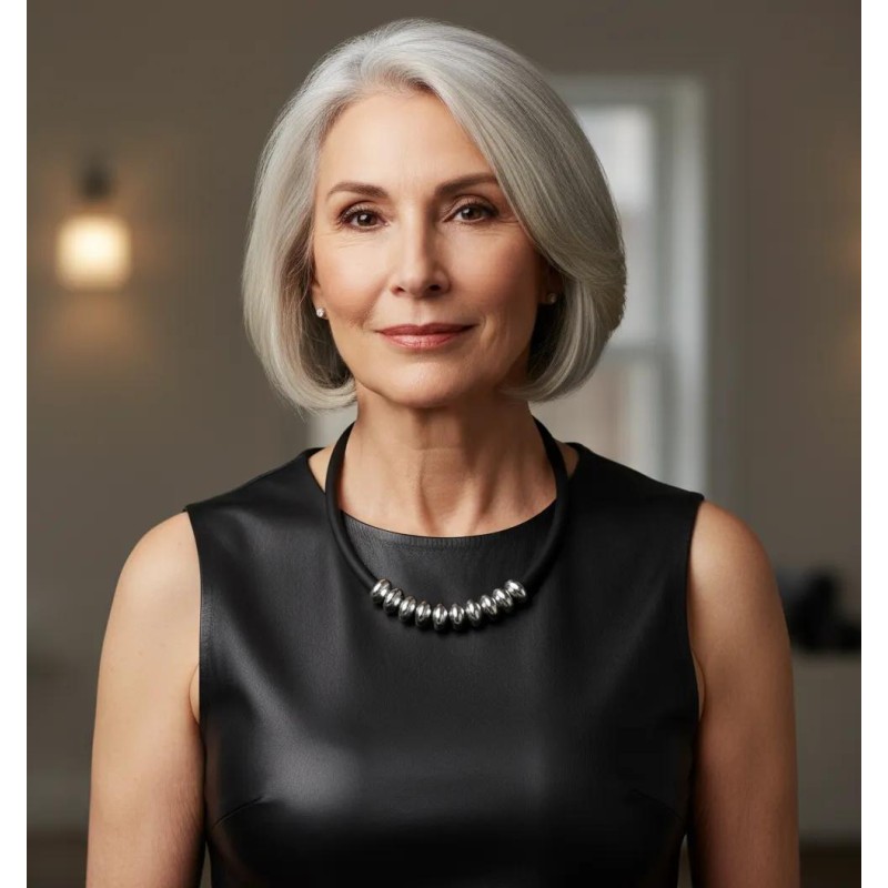 Rubber, metallic pearls, magnetic closure, simple, impactful.