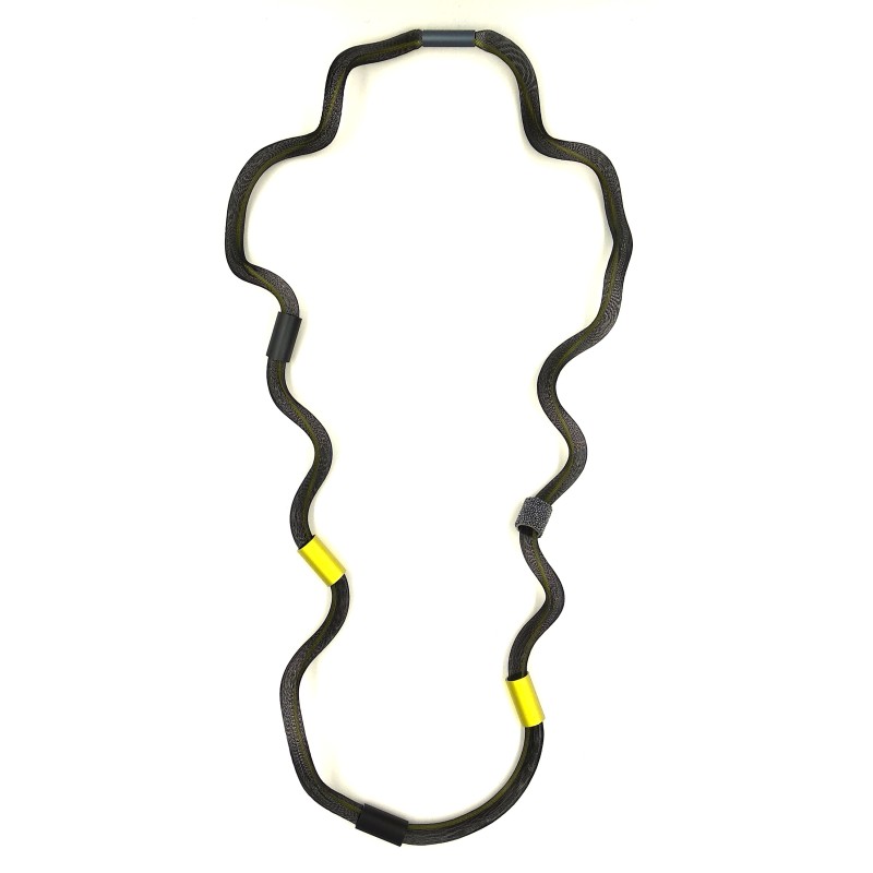 A truckload of small details are found in this creation: a thin mesh rope shaped with a wavy form that will keep its waves, filled with a colored cord and spiced up with anodized aluminum cylinders + one sparkly accent... because we can.  A light and comfortable 24" long