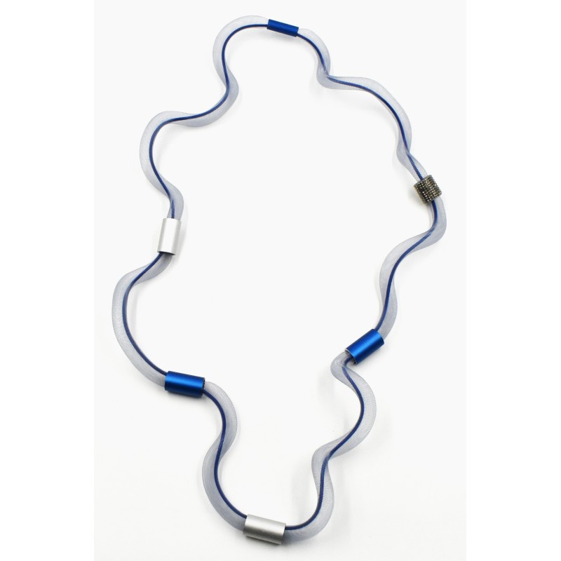 A truckload of small details are found in this creation: a thin mesh rope shaped with a wavy form that will keep its waves, filled with a colored cord and spiced up with anodized aluminum cylinders + one sparkly accent... because we can.  A light and comfortable 24" long