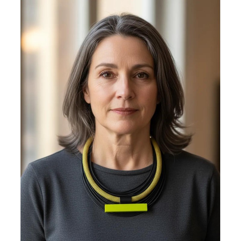 A contemporary design, easy to wear, with a nice contrast between the soft cotton cord holding an adonized aluminum bar over the flow of black strings