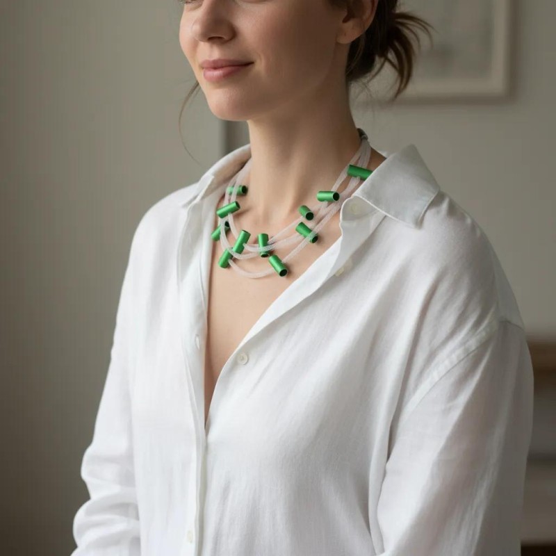 A light and summery 20" design with transparent mesh cords and anodized aluminum cylinders in deep colors. With magnetic closure.