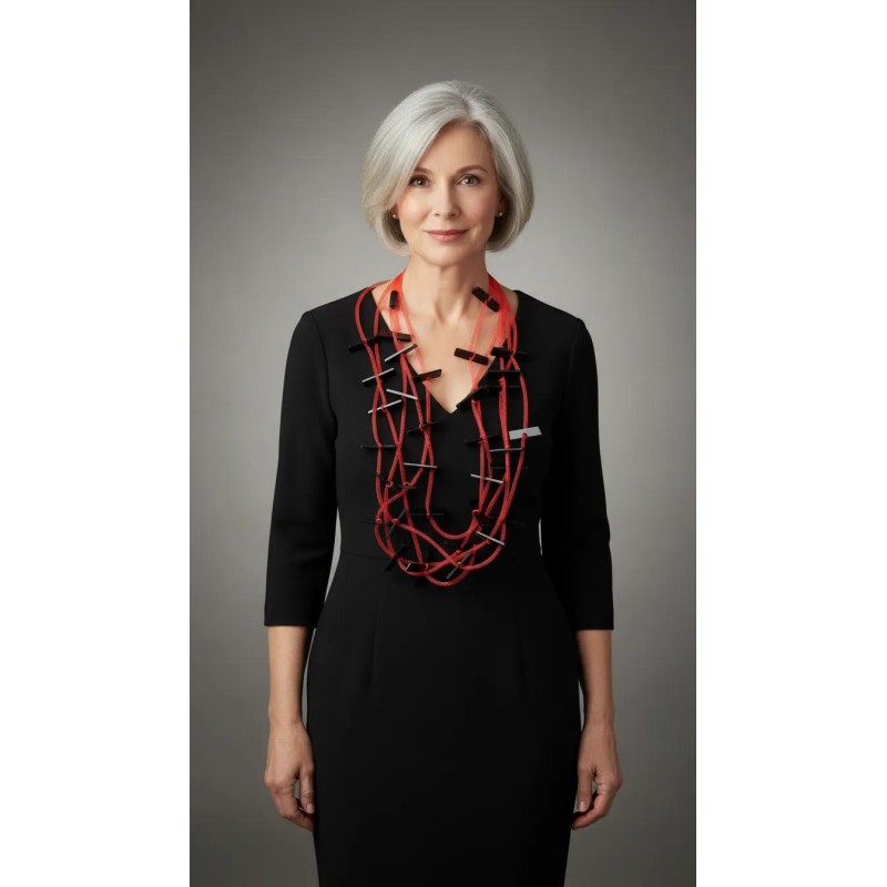 A light 24" design with transparent mesh cords and acrylic chips in deep colors. With magnetic closure.