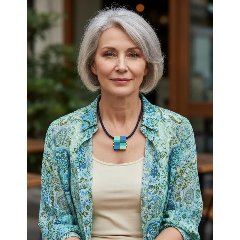 Necklace w/ a soft cord, and anodized aluminum cubes skillfully mounted like a puzzle.