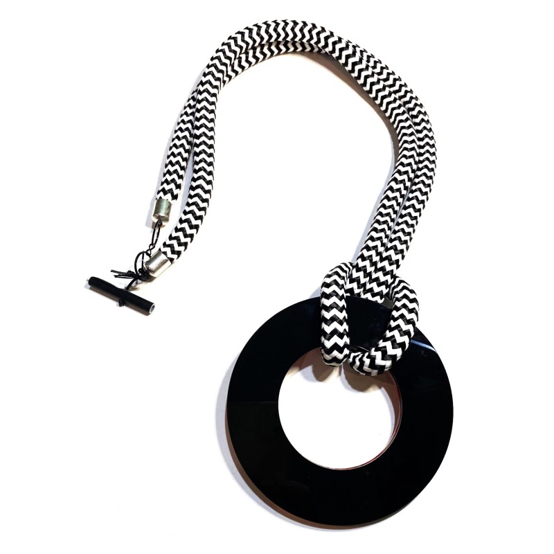 Extremely popular and easy to wear, 2 necklaces in one, reversible acrylic donut on a 30" long cord