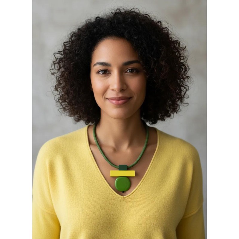 Necklace w/ a soft cord, an anodized aluminum pendant w/ an acrylic accent.